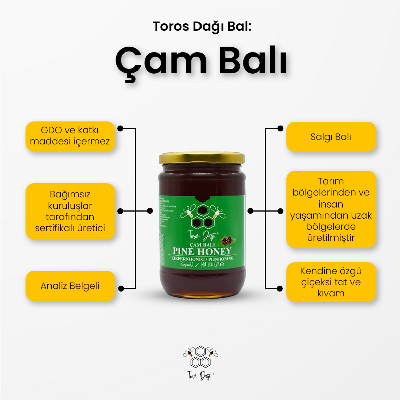 Bu salgı balı, floral ballara göre daha koyu renge, yoğun kıvama ve tok bir lezzet profiline sahiptir. Çam Balı, hızlı kristalize olmayan bir yapıya sahiptir.