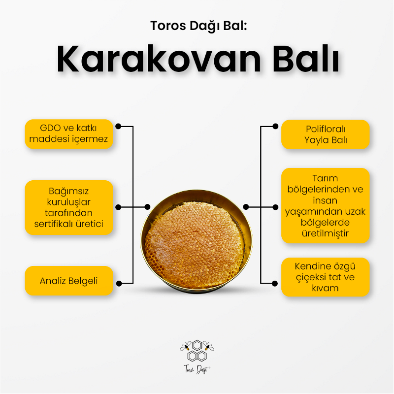 Karakovan balı 1,4 Kg Torosların yüksek yamaçlı yaylalarında arıların tamamen doğal koşullarda, kendi ördükleri peteklerde ürettiği katkısız ve saf baldır.