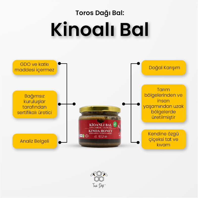 Kinoa Karışımı Bal, %100 doğal bal ve kinoadan elde edilen bir bal ürünüdür. Yetişme döneminde çiçeklenen kinoa bitkisinin özlerinden arılar tarafından elde edilen bu bal farklı bir üründür. Toros Dağı yöresinde üretilen bu doğal ürün lezzeti ve faydalarıyla en iyi bal ürünlerinden biridir.