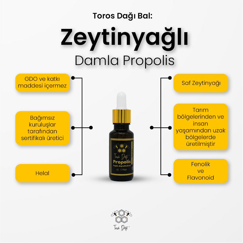 Toros Dağı Bal tarafından özenle hazırlanan Zeytinyağı ile çözünmüş Propolis Damla, geleneksel arı ürünlerini buluşturan sade ve etkili bir formüle sahiptir.